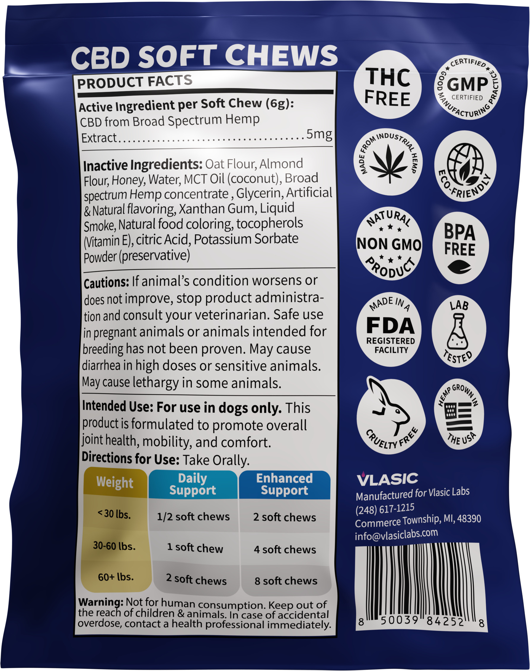 Our new formula is 3X BIGGER than before and easier to chew for older dogs. At Vlasic Labs, dogs are part of the family. This Broad Spectrum chew contains ZERO THC and 5mg of CBD per chew, so you can easily find the right dose for your pup.