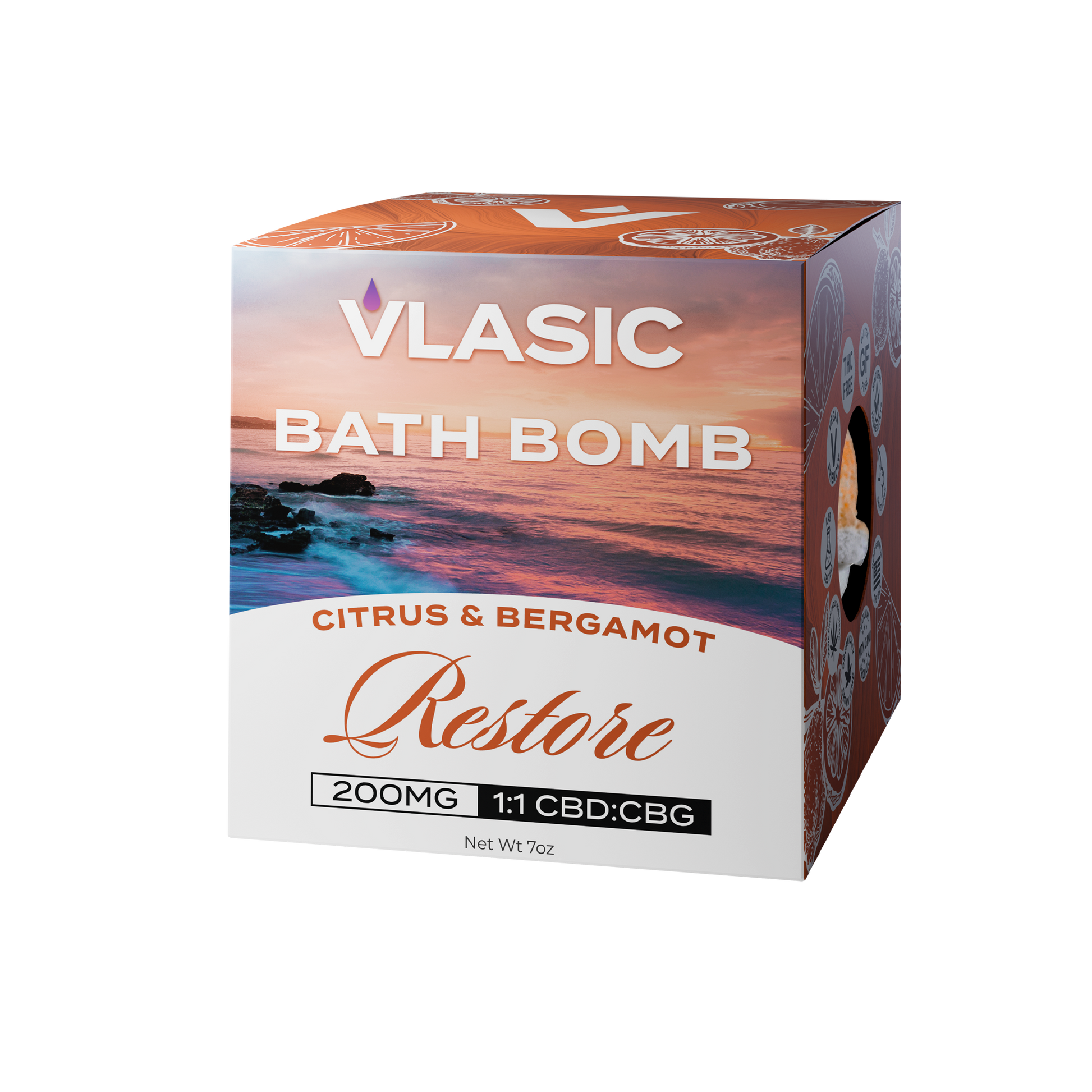 The Restore Bath Bomb combines 100mg of CBD and 100mg of CBG with uplifting citrus aromas.